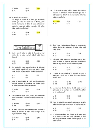 Este documento presenta 15 problemas de edades que involucran cálculos matemáticos para determinar las edades de personas en diferentes momentos del tiempo. Los problemas implican sumas, restas, multiplicaciones y divisiones de edades actuales y pasadas para resolver por deducción lógica las edades requeridas.