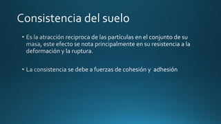 El documento describe las principales propiedades físicas del suelo como la densidad, consistencia, plasticidad y profundidad radicular. Explica que la densidad aparente depende de la proporción de espacios porosos y sólidos en el suelo. También cubre cómo la humedad, compactación y cementación afectan la consistencia del suelo. Finalmente, destaca que la profundidad radicular óptima para los cultivos se encuentra entre los 80-100 cm de profundidad.