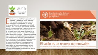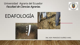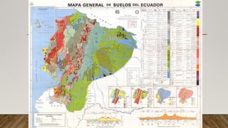 El documento proporciona una introducción a la edafología, que estudia la composición y naturaleza del suelo y su relación con las plantas y el entorno. Explica que el suelo es un sistema dinámico formado por la alteración de las rocas por factores climáticos y biológicos. También describe brevemente los tipos de suelos del Ecuador y los desafíos relacionados con su uso y conservación debido a las condiciones de ladera.