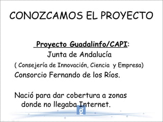 El documento describe el proyecto Guadalinfo/CAPI de la Junta de Andalucía, el cual tiene como objetivo reducir la brecha digital y fomentar la participación en la sociedad de la información de colectivos en riesgo de exclusión. El proyecto consiste en centros CAPI ubicados en barrios con necesidad de transformación social y centros Guadalinfo ubicados en pueblos pequeños, los cuales ofrecen cursos y talleres de alfabetización digital, ofimática, idiomas, búsqueda de empleo y ocio con