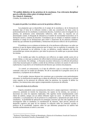 Este documento presenta la propuesta del análisis didáctico de las prácticas de enseñanza como una referencia disciplinar para la reflexión crítica del trabajo docente. Explica que la reflexión debe ser una reconstrucción crítica de la experiencia que involucre diálogo y debate. Propone el análisis didáctico como una alternativa que utiliza herramientas conceptuales y técnicas de investigación para analizar situaciones de práctica desde una perspectiva socio-antropológica.