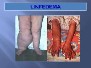 El documento presenta información sobre el edema, incluyendo sus causas, tipos y semiólogía. Puede ser causado por aumento de la presión venosa, disminución de la presión oncótica plasmática o aumento de la permeabilidad capilar. Existen edemas localizados y generalizados, siendo este último causado por exceso de líquido en el espacio intersticial. La semiólogía incluye evaluar la localización, intensidad, consistencia, elasticidad, temperatura y sensibilidad del edema.
