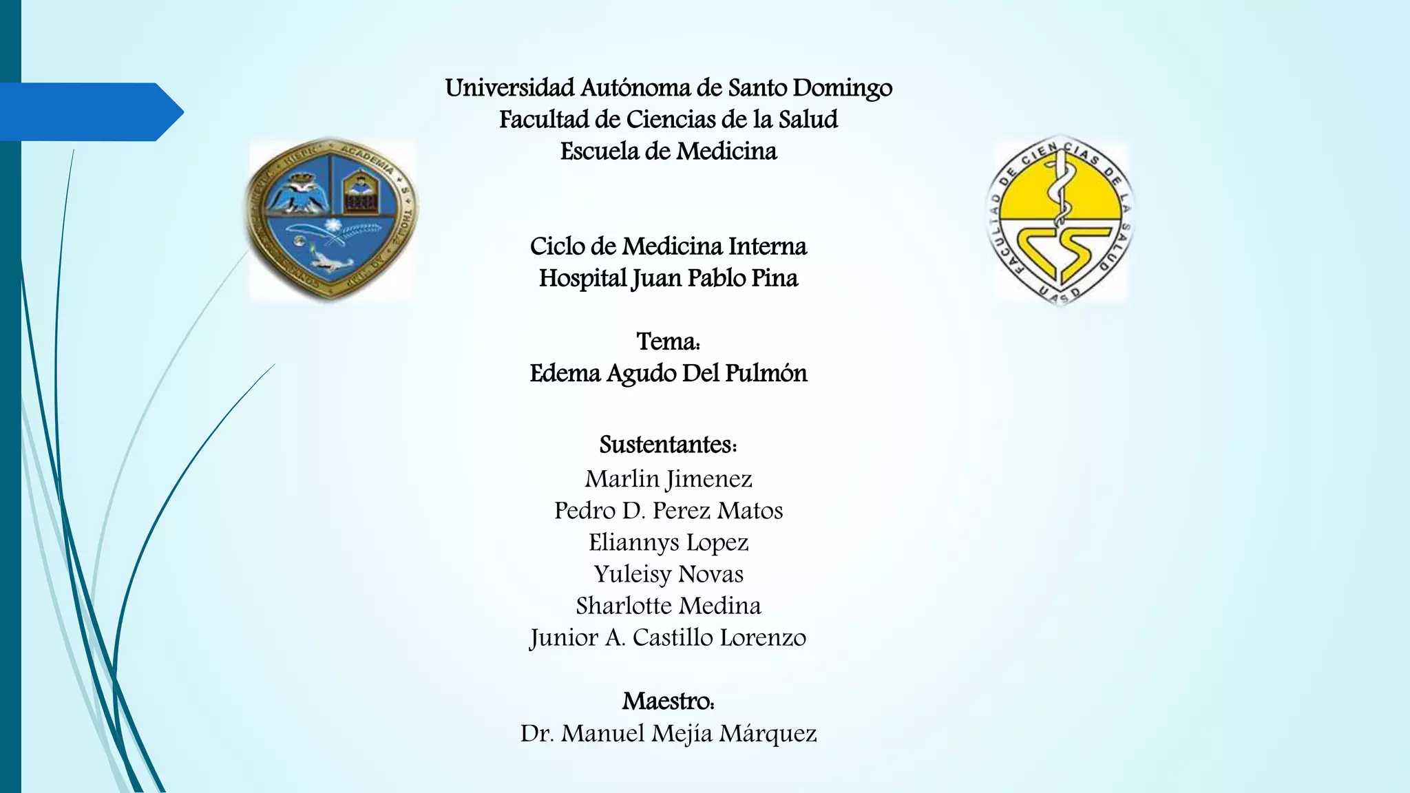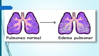 El documento presenta información sobre el edema agudo de pulmón, definiéndolo como la acumulación anormal y de rápido desarrollo de líquido en los pulmones. Describe algunas de sus causas como infarto agudo del miocardio, arritmias cardiacas e insuficiencia ventricular izquierda grave. Explica su fisiopatología relacionada con cambios en las fuerzas hemodinámicas que regulan el movimiento de líquido entre los vasos sanguíneos y los tejidos. Finalmente, detalla algunos aspect