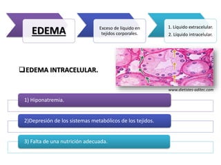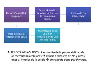El documento describe los mecanismos de edema intracelular y extracelular, así como los factores que los causan. Explica que existen tres mecanismos de seguridad que normalmente impiden el edema: 1) la baja distensibilidad del tejido cuando la presión es negativa, 2) el aumento del flujo linfático, y 3) la reducción de proteínas en el líquido intersticial. Estos mecanismos previenen la acumulación de líquido hasta que la presión alcanza 17 mmHg.