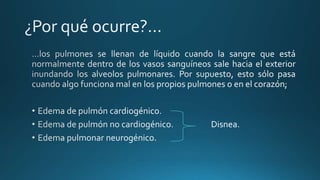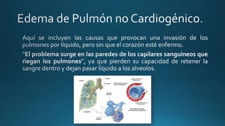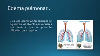 El documento describe la insuficiencia cardíaca izquierda, una afección en la que el corazón no bombea sangre de manera efectiva a través del cuerpo. La sangre se acumula en los pulmones debido a un mal funcionamiento del lado izquierdo del corazón. La insuficiencia cardíaca izquierda se clasifica en cuatro grados y pasa por cuatro fases: inicial, latente, insuficiencia respiratoria y consolidada. Los síntomas pueden incluir fiebre en caso de neumonía y tensión arterial baja en