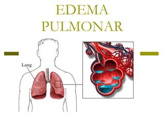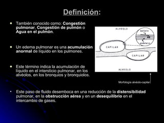 El edema pulmonar es la acumulación anormal de líquido en los pulmones, lo que dificulta la respiración y el intercambio de gases. Puede ser causado por una disfunción cardíaca o por factores que aumentan la permeabilidad de los capilares pulmonares. Los síntomas incluyen dificultad para respirar, tos y expectoración espumosa. El tratamiento se enfoca en identificar y tratar la causa subyacente, así como en combatir la hipoxia y eliminar el exceso de líquido a través de di