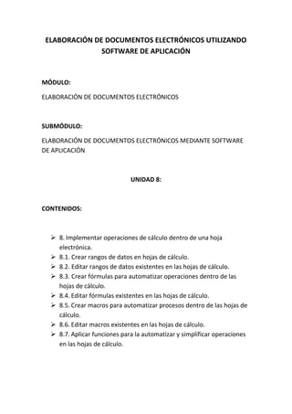 Este documento describe cómo implementar operaciones de cálculo dentro de hojas electrónicas utilizando software de aplicación. Explica cómo crear y editar rangos de datos, fórmulas y macros, así como aplicar funciones para automatizar y simplificar operaciones en hojas de cálculo.
