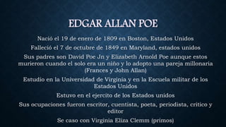 Este documento resume la vida y obra del escritor estadounidense Edgar Allan Poe. Nació en 1809 y murió en 1849. Fue escritor, poeta y editor conocido por sus historias de misterio y terror psicológico como "El cuervo", "El gato negro" y "El demonio de la perversidad". Se casó con su prima Virginia Clemm, cuya muerte inspiró poemas como "Annabel Lee". El documento analiza algunas de sus obras más famosas y ofrece opiniones sobre su estilo gótico y la triste