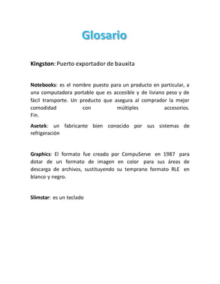 El documento habla sobre notebooks, un tipo de computadora portátil liviana y fácil de transportar. También menciona Asetek, un fabricante conocido de sistemas de refrigeración, y el formato gráfico GIF. Finalmente, describe las características y funciones del teclado inalámbrico Slimstar 8000/8050, incluyendo su precisión óptica, batería de larga duración y teclas multimedia.