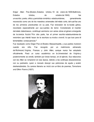 El documento presenta una biografía de Edgar Allan Poe. Nació en Boston en 1809 y quedó huérfano de padres a temprana edad. Fue adoptado por una familia adinerada de Virginia. Estudió en la Universidad de Virginia aunque la abandonó debido a problemas con su padrastro. Se dedicó a la escritura y publicó su primer libro de poemas en 1827. Es reconocido como uno de los maestros universales del cuento corto y renovador del género de terror y ciencia ficción. Falleció en 1849 en Baltimore.