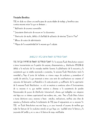 EDI es una herramienta que permite el intercambio electrónico de datos entre empresas para agilizar procesos comerciales. Ofrece beneficios como la reducción de errores, costos y stocks, así como una mejor competitividad. La empresa Foods Distributions implementó EDI debido a que su crecimiento y la globalización le generaban dificultades en la gestión de compras, almacenamiento y distribución. EDI automatizó procesos como la verificación de facturas, agilizando la contabilidad pero generando también riesgo de desempleo al