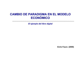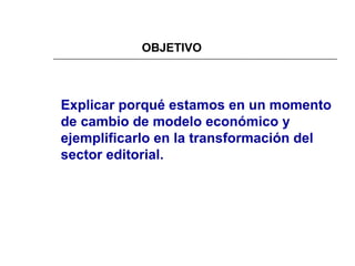 El documento describe el cambio de paradigma del modelo económico industrial a uno basado en el conocimiento y la información. Explica que la sociedad actual es una sociedad de la información donde el conocimiento es el eje del proceso productivo. Usa el ejemplo del sector editorial para ilustrar los retos y transformaciones que conlleva este cambio de modelo, incluyendo nuevos formatos como el ebook, modelos de negocio como el pago de contenidos digitales y desafíos sobre la cadena de valor y financiación en la nueva economía del conocimiento.