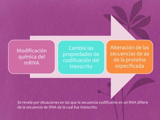La desaminación es una modificación química del mRNA que causa cambios en la secuencia de aminoácidos de las proteínas. En células de mamíferos, la desaminación de una citosina a uracilo en el mRNA puede cambiar un codón de glutamina a uno de parada, dando como resultado una proteína truncada. Otro ejemplo es la desaminación que cambia un codón de glutamina a arginina en receptores de glutamato en el cerebro de rata, afectando su conductividad. La desaminación es catalizada por enz