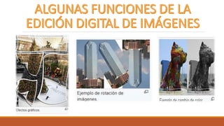La edición digital de imágenes permite optimizar, manipular y retocar imágenes digitales escaneadas o fotografías para corregir fallas, eliminar defectos y agregar objetos. Los editores de imágenes ofrecen herramientas como oscurecer, aclarar, seleccionar áreas, aplicar filtros y efectos, y cambiar el color, tono y contraste de las imágenes. La edición digital se usa cada vez más en casa y de manera profesional por fotógrafos y diseñadores.