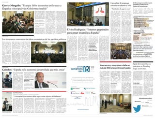 El documento resume la sexta edición del Spain Investors Day, un evento anual que reúne a inversores internacionales con empresas españolas. Participaron 40 grandes empresas cotizadas españolas y 150 inversores de 12 países. Hubo más de 550 reuniones privadas entre empresas e inversores. Varios ministros del gobierno español y la presidenta de la CNMV hablaron sobre la economía española y los mercados financieros. El evento tuvo gran cobertura mediática y sirvió para que inversores extranjeros conocieran mejor las