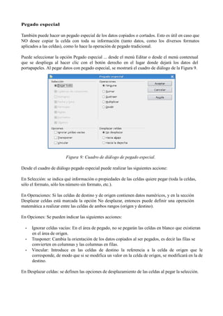 Este documento describe las funciones de edición y formato de celdas en OpenOffice Calc. Explica cómo modificar el contenido de una celda, cortar, copiar y pegar datos entre celdas, asignar formatos numéricos y de texto a celdas, y aplicar formatos automáticos a áreas de datos.