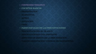 Este documento describe las herramientas básicas de edición de presentaciones electrónicas, incluyendo cómo seleccionar, mover, copiar, borrar e insertar diapositivas y objetos. Explica cómo alinear y distribuir objetos dentro de las diapositivas, así como los diferentes formatos y estilos que se pueden aplicar a texto, imágenes y otros elementos. Finalmente, cubre herramientas para animación, audio y video.