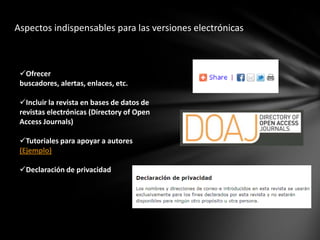 El documento describe los requisitos y procesos para publicar una revista científica de calidad, incluyendo la normalización, identificación de la revista, procesos editoriales, indización, y autoevaluación. Explica elementos como el consejo editorial, objetivos de la revista, sistemas de indización, derechos de autor, y formato de artículos. También cubre la publicación electrónica y cómo lograr que una revista sea indizada en importantes bases de datos.