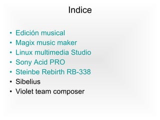 El documento proporciona información sobre varios programas de edición musical. Describe brevemente las funciones de Magix Music Maker, Linux Multimedia Studio, Sony Acid PRO, Steinberg Rebirth RB-338, Sibelius y Violet Team Composer. Incluye detalles como sus precios y capacidades para componer, grabar, editar y reproducir música.