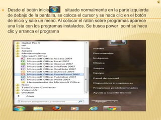 Este documento proporciona instrucciones paso a paso para utilizar Microsoft PowerPoint. Cubre temas como crear y guardar presentaciones, trabajar con diapositivas, texto, tablas, gráficos, organigramas, sonido, animaciones y transiciones. El documento parece ser parte de un curso o tutorial para enseñar el uso básico de PowerPoint.