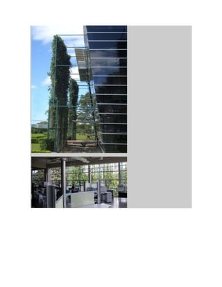 El edificio utiliza una pantalla estructurada de acero cubierta con una piel vegetal de hojas persistentes para reducir la temperatura interior en unos 4°C. Se diseñó una estructura modular de hormigón de 10x10m para cumplir con un presupuesto restrictivo de $400 por metro cuadrado. La envolvente vegetal y las aceras empedradas húmedas ayudan a mantener fresco el edificio y disminuir la carga térmica en el clima tropical.