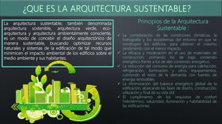 Este documento describe los principios de la arquitectura sustentable, incluyendo considerar las condiciones climáticas locales, usar materiales de bajo impacto ambiental, reducir el consumo de energía y minimizar el impacto ambiental a lo largo de todo el ciclo de vida del edificio. También explica que los edificios tienen un gran impacto en el consumo energético y las emisiones, por lo que es importante diseñarlos de forma responsable y eficiente.