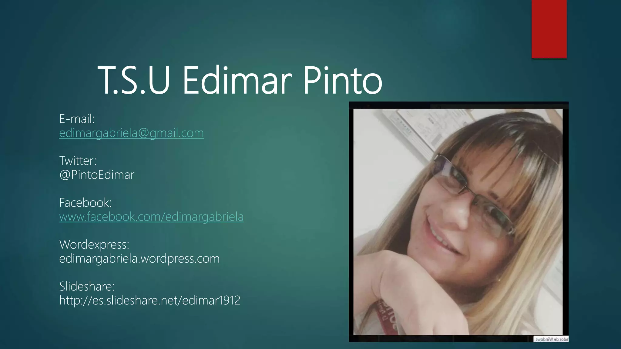 Edimar Pinto proporciona sus contactos en varias plataformas de redes sociales y blogs, incluyendo su dirección de correo electrónico, cuenta de Twitter, página de Facebook, blog de Wordpress y perfil de Slideshare.