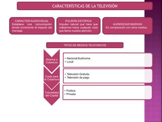 El documento describe las características y tipos de varios medios de comunicación masiva como la televisión, radio, medios impresos, medios exteriores y cine. Explica que cada medio tiene ventajas y desventajas para la publicidad y cómo las empresas pueden comprar espacios publicitarios en cada plataforma.
