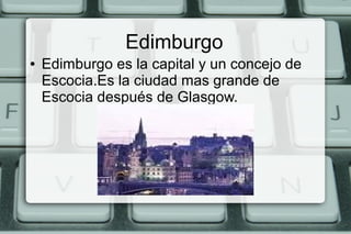 Este documento proporciona información sobre un viaje a Edimburgo, Escocia por 386 euros desde Palma de Mallorca. Incluye detalles sobre los vuelos de ida y vuelta con Easy Jet y Flybe, así como una breve descripción de Edimburgo y sus principales atracciones como el Castillo de Edimburgo y Camara Oscura. También lista varios restaurantes, comidas y bebidas típicas de la región como el whisky single malt y haddock, así como una experiencia positiva del viajero durante sus 6 días en la