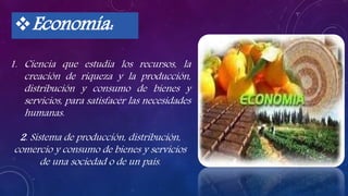 La economía estudia los recursos, la creación de riqueza y la producción, distribución y consumo de bienes y servicios para satisfacer las necesidades humanas. Es una ciencia social que examina cómo los sistemas económicos complejos evolucionan bajo diferentes condiciones iniciales de manera impredecible. La economía es relevante en la vida diaria porque todas las actividades desde despertarse hasta dormir involucran el consumo de bienes y servicios que requieren recursos, producción y distribución.