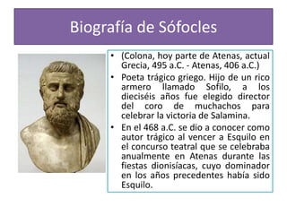 Edipo Rey es una tragedia escrita por Sófocles en el siglo V a.C. que explora el destino ineludible de Edipo, quien sin saberlo mata a su padre y se casa con su madre. A pesar de los intentos de Edipo y Yocasta por escapar de sus destinos profetizados, terminan cumpliéndolos y son castigados por sus acciones inconscientes. El coro representa al pueblo de Tebas y observa los acontecimientos con preocupación por el futuro de su ciudad.