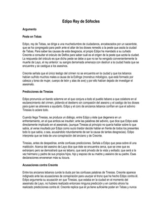 Edipo se convierte en rey de Tebas después de resolver el enigma de la Esfinge. Una plaga asola la ciudad, por lo que Edipo envía a Creonte a consultar el oráculo de Delfos. El oráculo responde que la plaga continuará hasta que se castigue al asesino del anterior rey, Layo. Tras varias revelaciones, Edipo descubre que él mató a su padre Layo años atrás y se casó con su madre Yocasta. Horrorizado, Yocasta se suicida y Edipo se arranca los ojos y es dest