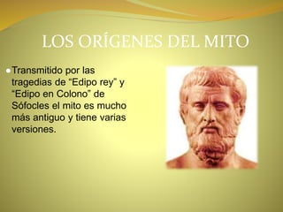El mito de Edipo se remonta a versiones antiguas pero fue popularizado por las tragedias de Sófocles. Un oráculo predijo que el hijo de Layo mataría a su padre y se casaría con su madre, por lo que Layo abandonó a Edipo siendo bebé. Edipo fue adoptado y criado en Corinto, pero al saber la profecía huyó hacia Tebas. Allí resolvió el enigma de la Esfinge, se casó con Yocasta sin saber que era su madre, y cumplió el oráculo matando a Layo sin