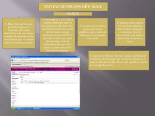 El documento proporciona instrucciones sobre cómo administrar una cuenta de correo electrónico y enviar mensajes. Explica los pasos para ver los correos recibidos, marcar correo no deseado, usar la carpeta de borradores, ver los correos enviados y eliminados. También detalla cómo enviar un correo, incluir destinatarios, copias, asunto, adjuntos y enviar el mensaje. Por último, menciona algunas herramientas adicionales como mensajería instantánea y aplicaciones de Office.