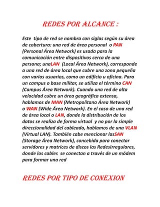 Una red informática es un conjunto de dispositivos interconectados que comparten información y recursos. Las redes se clasifican por su alcance (PAN, LAN, WAN, etc.), el tipo de conexión (cableada, inalámbrica), la relación funcional entre nodos (cliente-servidor, P2P), la topología de conexión de los nodos (bus, estrella, malla, etc.), y la direccionalidad de los datos (simplex, semiduplex, fullduplex).