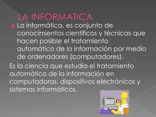 La informática estudia el tratamiento automático de la información por medio de ordenadores. Se compone de hardware físico como el teclado, monitor y almacenamiento, y software que son las instrucciones para que funcione el ordenador. Permite la entrada, salida y almacenamiento de datos a través de dispositivos como Bluetooth, USB y multimedia.