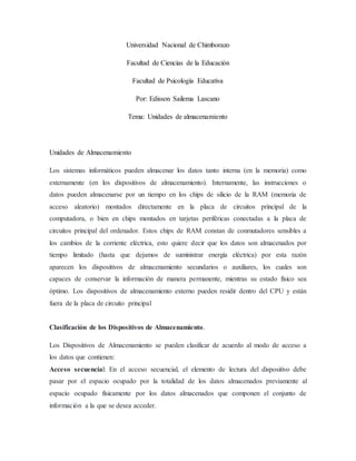 El documento describe diferentes tipos de unidades de almacenamiento, incluyendo RAM, ROM, discos duros, unidades de disco flexible, unidades Zip, unidades flash USB y discos ópticos como CD y DVD. Explica cómo estos dispositivos almacenan datos de forma permanente o temporal y la clasificación de acceso secuencial vs aleatorio.