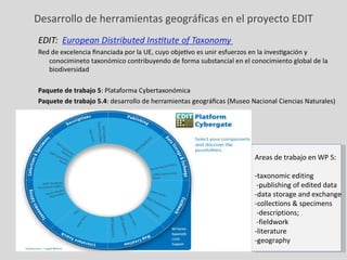 Este documento describe el desarrollo de herramientas geográficas en el proyecto EDIT. Se construyó una infraestructura centralizada de datos geográficos y se desarrollaron dos aplicaciones web: mapRest services y EDIT mapViewer. Estas herramientas permiten visualizar y analizar información georreferenciada de diferentes fuentes de forma estandarizada y a través de servicios web de código abierto.