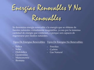 El documento trata sobre las diferentes fuentes de energía renovables y no renovables. Describe las principales energías renovables como la eólica, solar, hidráulica, geotérmica y mareomotriz, así como sus características. También describe brevemente las energías no renovables como el petróleo, carbón y gas natural, señalando que son recursos limitados.