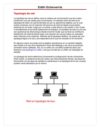 Edith Echeverría Topología dered La topología de red se define como la cadena de comunicación que los nodos conforman una red usada para comunicarse. Un ejemplo claro de esto es la topología de árbol, la cual es llamada así por su apariencia estética, por la cual puede comenzar con la inserción del servicio de internet desde el proveedor, pasando por el router, luego por un switch y este deriva a otro switch u otro router o sencillamente a los hosts (estaciones de trabajo), el resultado de esto es una red con apariencia de árbol porque desde el primer router que se tiene se ramifica la distribución de internet dando lugar a la creación de nuevas redes y/o subredes tanto internas como externas. Además de la topología estética, se puede dar una topología lógica a la red y eso dependerá de lo que se necesite en el momento. En algunos casos se puede usar la palabra arquitectura en un sentido relajado para hablar a la vez de la disposición física del cableado y de cómo el protocolo considera dicho cableado. Así, en un anillo con una MAU podemos decir que tenemos una topología en anillo, o de que se trata de un anillo con topología en estrella. La topología de red la determina únicamente la configuración de las conexiones entre nodos. La distancia entre los nodos, las interconexiones físicas, las tasas de transmisión y/o los tipos de señales no pertenecen a la topología de la red, aunque pueden verse afectados por la misma. Red en topología de bus.