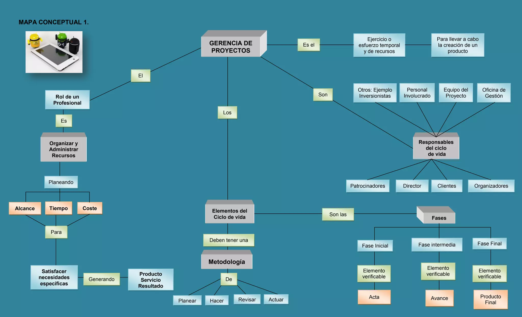 El documento presenta un mapa conceptual sobre la gerencia de proyectos. Explica que la gerencia de proyectos involucra organizar y administrar recursos como el alcance, tiempo y costo para satisfacer necesidades específicas mediante la creación de un producto, servicio o resultado. También describe los elementos del ciclo de vida de un proyecto como la planificación, ejecución, supervisión y cierre, así como los roles de las personas involucradas.
