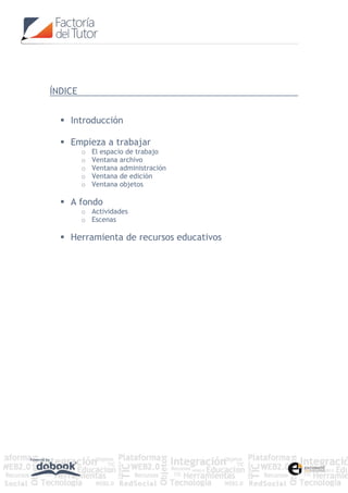 Este documento presenta el manual de usuario de un editor didáctico. Describe las diferentes ventanas del espacio de trabajo como archivo, administración, edición y objetos. Explica cómo insertar y configurar objetos multimedia como imágenes, texto, actividades y saltos entre páginas. También cubre temas como galerías de objetos, previsualización del cuaderno y herramientas de diseño.