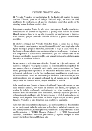 El Proyecto Prometeo Mejía es una iniciativa del Rector del Colegio Nacional Mejía para fomentar la excelencia académica y el interés por la ciencia entre los estudiantes. Comenzó en 2012 con un grupo de 8 estudiantes que desarrollan material didáctico y conocimiento científico para transmitir la ciencia a sus compañeros de manera accesible. El objetivo es traducir el conocimiento inalcanzable a un lenguaje cotidiano para incentivar el estudio de la ciencia.