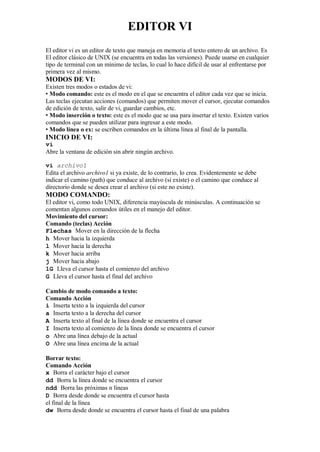 El editor vi es un editor de texto clásico de UNIX que maneja el texto de un archivo en memoria. Tiene tres modos: modo comando para mover el cursor y ejecutar acciones, modo inserción para agregar texto, y modo línea para escribir comandos. Vi permite mover, copiar, cortar y pegar texto, deshacer cambios, y buscar cadenas dentro de un archivo.