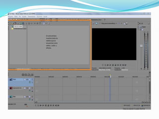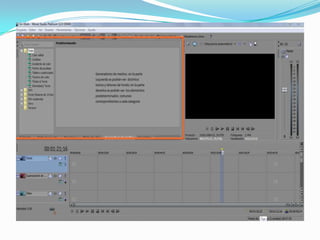 Este documento describe los editores de audio y video, incluyendo sus funciones principales. Los editores de audio permiten editar archivos de sonido digitalmente, mientras que los editores de video permiten editar y procesar videos. Se mencionan varios ejemplos populares de editores de audio como Audacity y FL Studio, y editores de video como Windows Movie Maker, Sony Vegas Pro, y Adobe Premiere Pro. Finalmente, se describen las actividades que pueden realizarse con el software Vegas Movie Studio Platinum Edition.