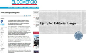 El documento describe las características de un editorial periodístico. Explica que un editorial es la voz colectiva del medio de comunicación y expresa su opinión sobre hechos noticiosos. Generalmente lo escribe el director o subdirector y otorga forma y alcance a la noticia según la orientación del periódico. También describe que los editoriales pueden ser cortos y contundentes o largos, y deben ser sustanciosos, contundentes, afirmados, penetrantes, ágiles, convincentes, breves y trascendentes. Además,