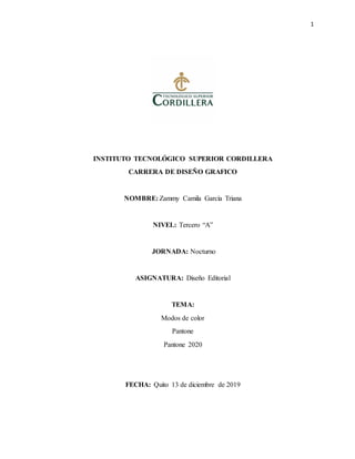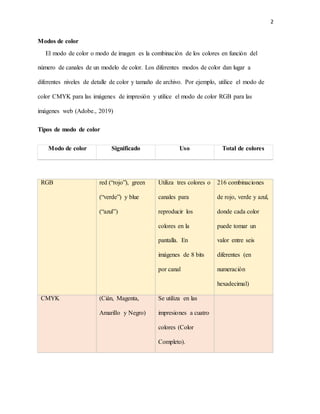 Este documento describe diferentes modos de color como RGB, CMYK, escala de grises y su uso. También explica qué es Pantone, cómo identifica colores de manera estandarizada para impresión. El color Pantone 2020 es Classic Blue 19-4052, un azul oscuro energético y dinámico escogido para representar las tendencias del diseño en ese año.