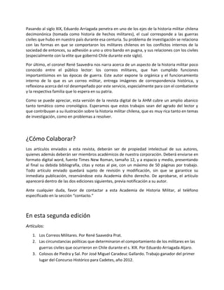 Este documento presenta la segunda edición de la revista digital "Campo de Marte" de la Academia de Historia Militar. Incluye varios artículos sobre temas de la Guerra del Pacífico como los prisioneros de guerra aliados en Chile y el papel de la prensa durante el conflicto. También contiene trabajos sobre la influencia española en el ejército chileno del siglo XIX y las guerras civiles del mismo periodo. Por último, presenta información sobre cómo colaborar enviando artículos a la revista.