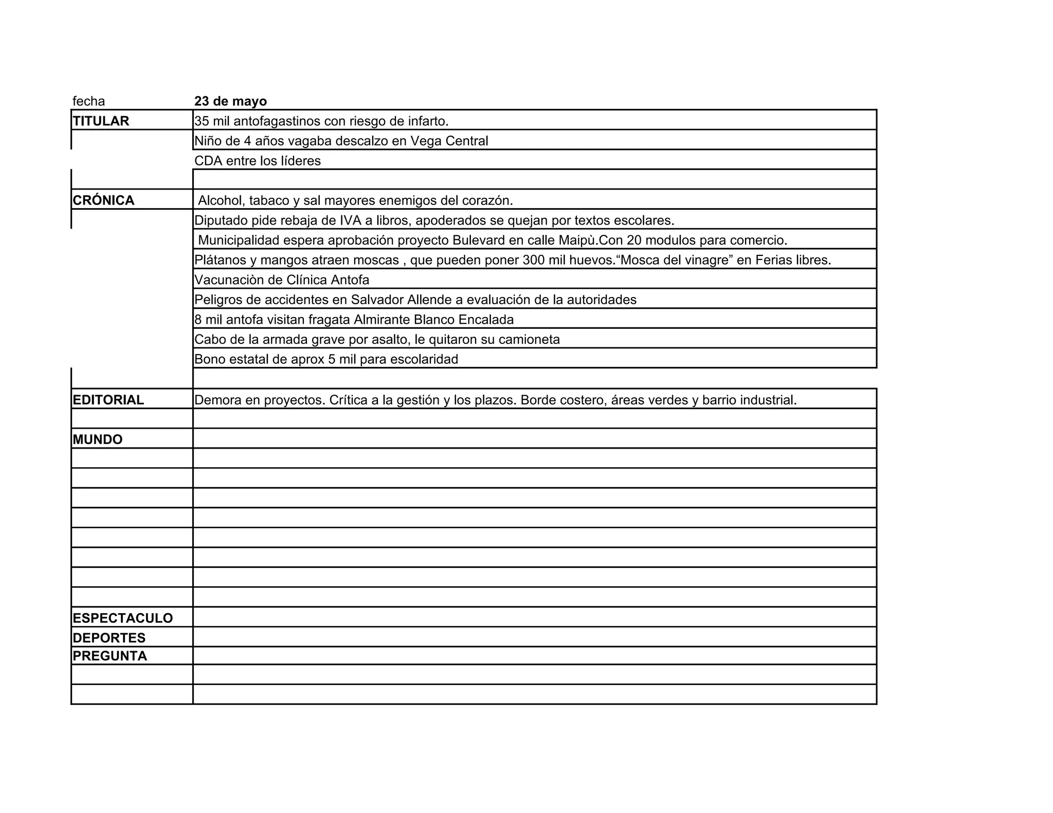 El documento presenta una crónica de noticias locales de Antofagasta del 23 de mayo. Incluye historias sobre 35 mil personas en riesgo de infarto, un niño descalzo encontrado, y una feria libre con problemas de moscas. También cubre temas de educación, seguridad vial, visitas a una fragata, y un bono estudiantil provincial. El editorial critica la demora en proyectos del gobierno y la gestión de plazos.