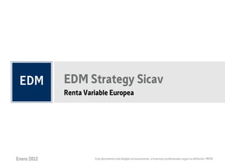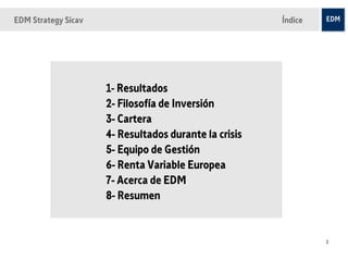 El documento presenta la estrategia de inversión de EDM Strategy SICAV en renta variable europea, destacando su enfoque en la generación consistente de alfa tanto en mercados alcistas como bajistas, con un rendimiento superior al índice Stoxx 50 en términos de rentabilidad y menor volatilidad. La filosofía de inversión se basa en la selección de compañías con negocios sólidos, perspectivas de crecimiento sostenible y alta liquidez, manteniendo una cartera concentrada y diversificada. Además, se proporciona una visión general del equipo de gestión y los resultados históricos del fondo, con énfasis en su capacidad para afrontar crisis financieras.